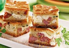 Bata os ingredientes da massa no liquidificador, unte uma forma e polvilhe farinha de trigo. Divida a massa em 2 partes e ao meio adicione o recheio.